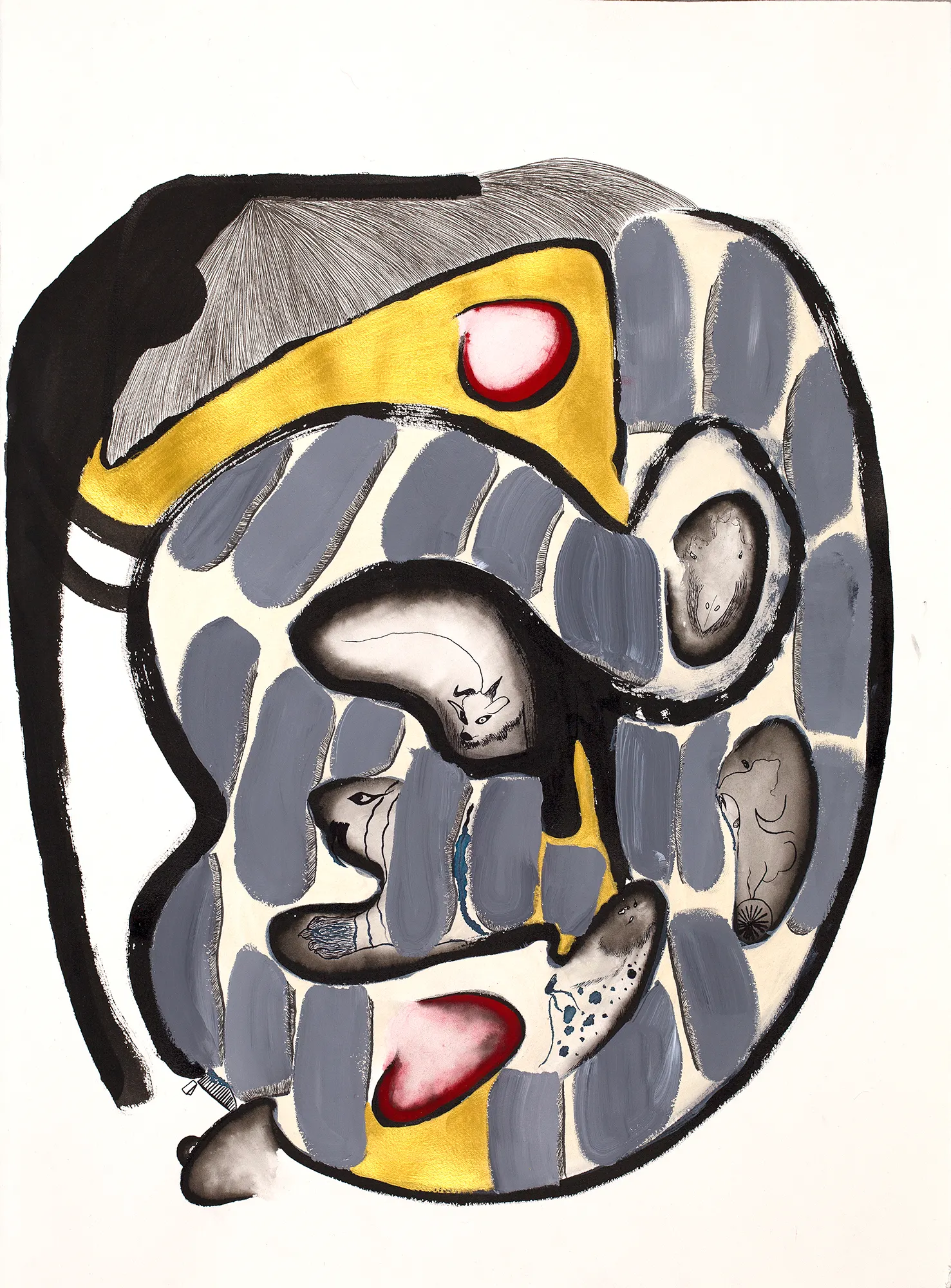 Escapea’r, Zoo in the grenade, 2021, Pen, gesso and acrylic on printmaking paper, 76.3cm x 56cm