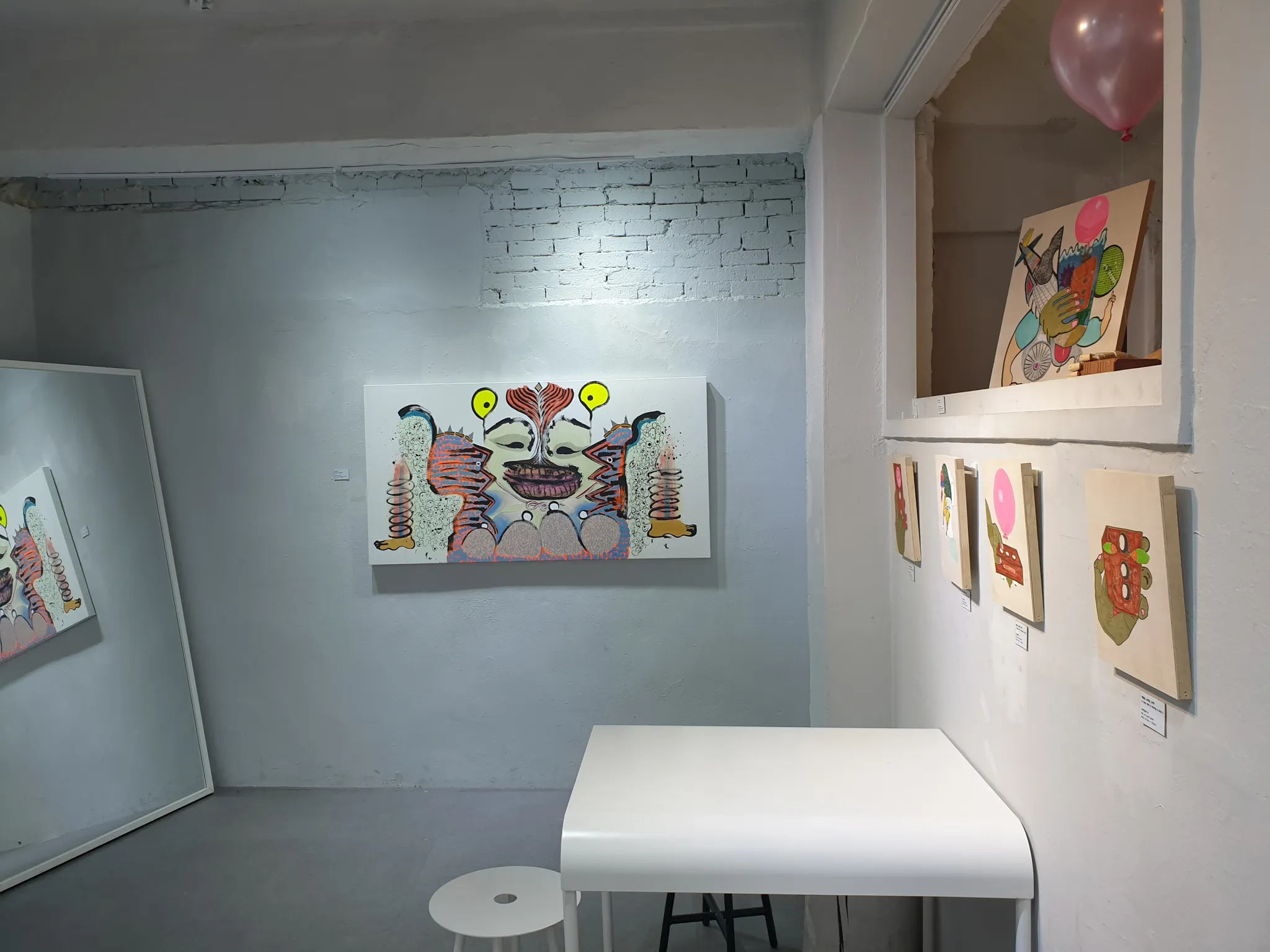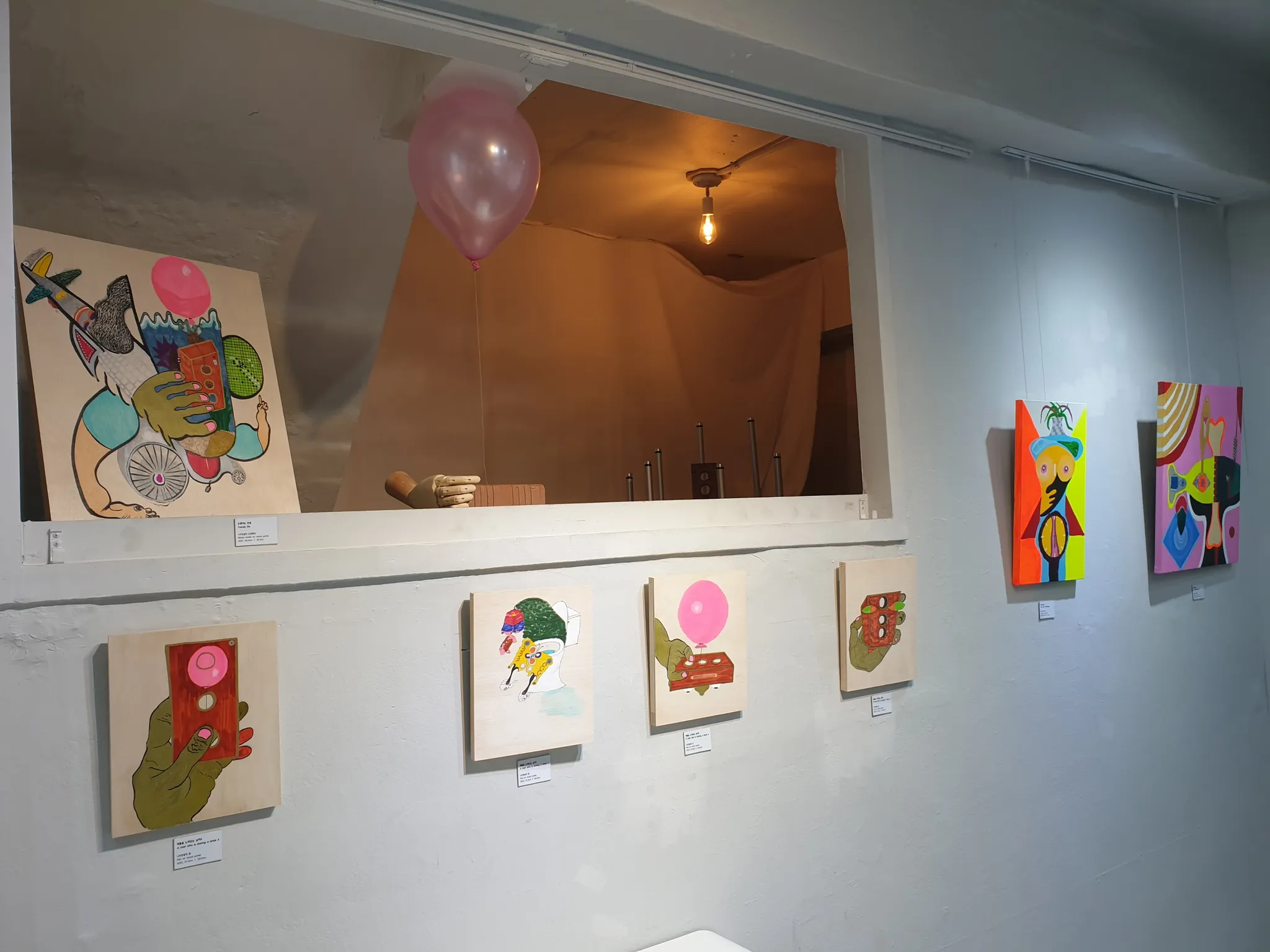 메인 전시공간과 분리된 바로 옆 별관의 전시전경. 풍선과 벽돌 등 일부 설치 작업도 진행하였다.